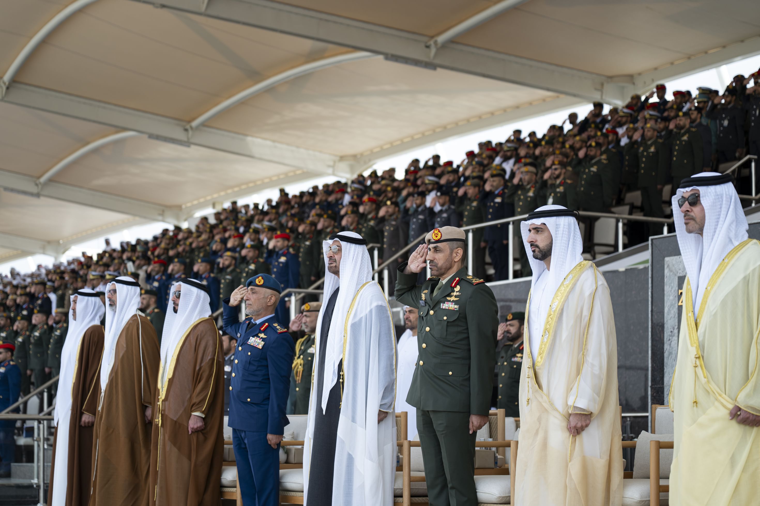 President His Highness Sheikh Mohamed bin Zayed Al Nahyan today attended the graduation ceremony of the 50th batch of officer cadets and the first batch of university officer cadets at Zayed II Military College in Al Ain. His Highness congratulated the graduates and wished them success in their military careers as they prepare to serve the nation, contribute to its continued growth, and embody the UAE’s deeply rooted values in promoting stability and peace across the region and the world. He also praised their future role in upholding the country’s humanitarian approach on both regional and international fronts. His Highness thanked the college’s command, faculty and staff for their dedicated efforts, highlighting the important role played by military colleges in equipping the UAE Armed Forces with highly qualified personnel who are well-trained in both theoretical knowledge and practical skills. The ceremony began with the UAE national anthem and included a military parade, an address by the college commander, and the honouring of top-performing graduates by His Highness the President. The graduates then took the official oath, and commemorative photographs were taken with His Highness. The ceremony was attended by H.H. Sheikh Khaled bin Mohamed bin Zayed Al Nahyan, Crown Prince of Abu Dhabi; H.H. Sheikh Hamdan bin Mohammed bin Rashid Al Maktoum, Crown Prince of Dubai, Deputy Prime Minister, and Minister of Defence; H.H. Sheikh Hazza bin Zayed Al Nahyan, Ruler’s Representative in Al Ain Region; H.H. Sheikh Nahyan bin Zayed Al Nahyan, Chairman of the Board of Trustees of the Zayed Charitable and Humanitarian Foundation; H.H. Lt. General Sheikh Saif bin Zayed Al Nahyan, Deputy Prime Minister and Minister of the Interior; H.H. Sheikh Hamdan bin Mohamed bin Zayed Al Nahyan, Deputy Chairman of the Presidential Court for Special Affairs; H.H. Sheikh Zayed bin Mohamed bin Zayed Al Nahyan; Sheikh Mohammed bin Hamad bin Tahnoun Al Nahyan, Adviser to the UAE President; Mohamed Mubarak Fadhel Al Mazrouei, Minister of State for Defence Affairs; Lieutenant General Engineer Issa Saif bin Ablan Al Mazrouei, Chief of Staff of the UAE Armed Forces; along with a number of Sheikhs, senior civilian and military officials, graduates' families, and guests.
